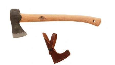 Wygodny trzonek siekiery wykonany z drewna hikorowego zaimpregnowanego olejem lnianym. Głownia siekiery jest ręcznie kuta z najwyższej jakości twardej stali. Krawędź tnąca siekiery jest fabrycznie zaostrzona do maksymalnego stopnia ostrości. Siekiera Gränsfors Bruks Hunter's Axe posiada skórzany pokrowiec, więc nie musimy martwić się o uszkodzenia ekwipunku oraz tępienie ostrza.