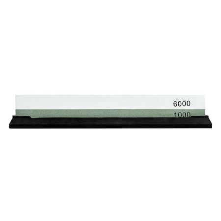 THE EDGE stone SHARP 1000/6000 to dwustronny kamień wodny z korundu, który przy odpowiedniej wprawie pozwala nadać nożowi perfekcyjnej ostrości. Kamień ma dwie gradacje tj. fine 1000 (ciemnoszarą) przeznaczoną do szybkiego podostrzania i wygładzania oraz ultra fine 6000 (białą) do ostrzenia właściwego oraz szybkiego podostrzania lekko stępionych narzędzi. Gradacje 1000 i 6000 świetnie sprawdzą się do polerowania noży kuchennych, brzytew oraz narzędzi, którym chcemy nadać idealną ostrość.vDuża powierzchnia (180×60 mm) sprawia, że na kamieniu możemy komfortowo ostrzyć także duże narzędzia np. siekiery, maczety.