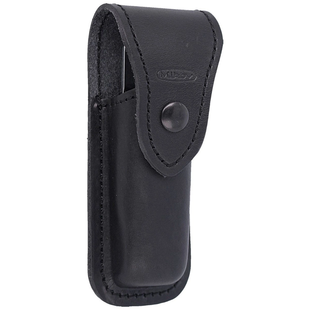 Etui - zapinane na zatrzask typu Prym. Wykonane z wysokiej jakości naturalnej skóry w kolorze czarnym z tłoczonym logo producenta. Pochwa posiada mocowanie do pasa lub oporządzenia umożliwiające przenoszenie noża w pozycji pionowej.