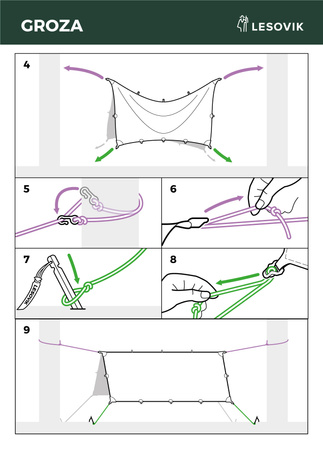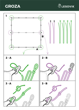 19 punktów mocowania odciągów pozwala na swobodne wykorzystywanie plandeki w różnych rolach – daszek dwuspadowy, jednospadowy, „diament”, schron, namiot hamakowy zamknięty – Groza to rozwiązanie wszechstronne. Aby jeszcze bardziej ułatwić obsługę tarpa, zastosowaliśmy system wbudowanych napinaczy linek. System zawieszenia jest prosty, daje się obsługiwać jedną ręką i nie wymaga znajomości węzłów. Wystarczy przyszpilić linkę do ziemi i naciągnąć. Regulator napięcia linki automatycznie blokuje ją przed luzowaniem.
