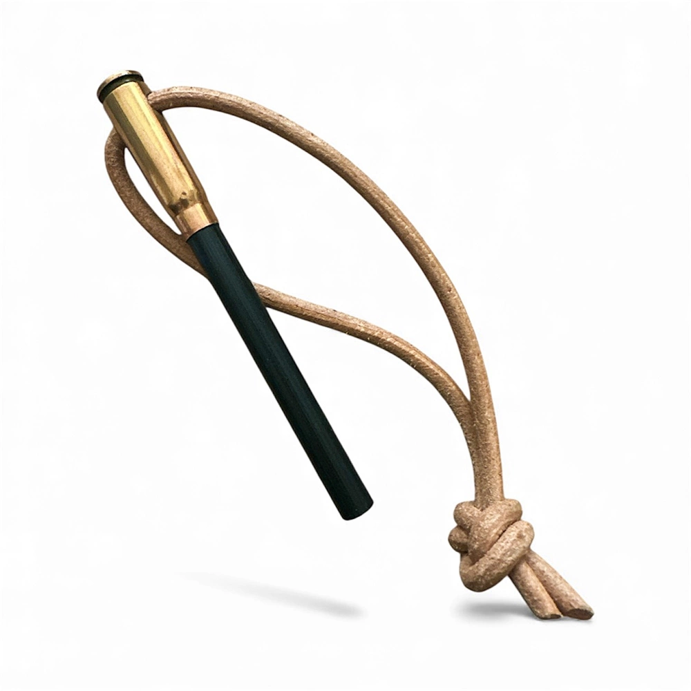 Krzesiwo z prętem o grubości 8 mm z uchwytem z mosiężnej łuski, dodatkowo wyposażone w skórzany rzemień.