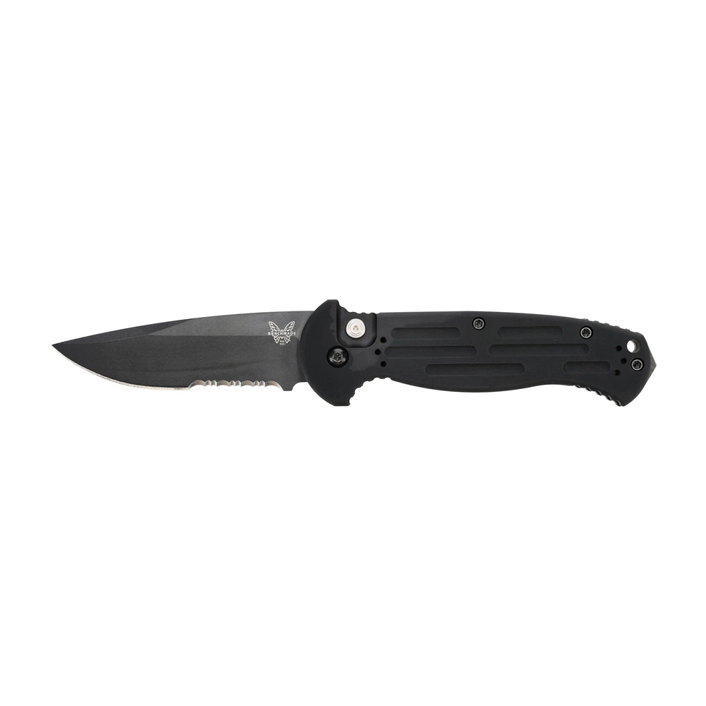 Benchmade 9051SBK AFO II to duży nóż automatyczny dla służb mundurowych, wyposażony w częściowo ząbkowane ostrze ze stali nierdzewnej CPM 154, powiększony przycisk do rozkładania oraz masywne okładziny z anodowanego aluminium.