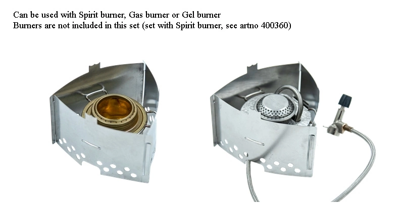 Praktyczna kuchenka, osłona na palnik spirytusowy (palnik nie jest w zestawie), która służy jako ruszt pod garnek. Ten zestaw jest bardzo lekki, kompaktowy i doskonale pasuje do każdego ekwipunku. Kuchenka wykonana ze stli nierdzewnej, po złożeniu zajmuje mało miejsca i można ją przenosić w praktycznym pokrowcu, który jest w zestawie. Ścianki kuchenki są zoptymalizowane pod kątem przepływu powietrza niezbędnego do procesu spalania oraz wykorzystania z różnymi naczyniami. Palnik gazowy (nie jest w zestawie) umieszcza się w środku w specjalnym uchwycie.