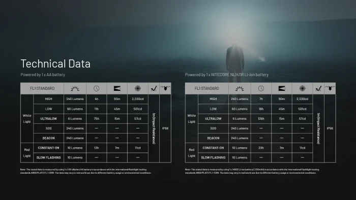 Światło białe: Wysokie – 240 lumenów – 4 godziny, Niskie – 60 lumenów – 10 godzin, Minimalne – 6 lumenów – 75 godzin; Czerwone światło: Stałe - 10 lumenów - 13 godzin