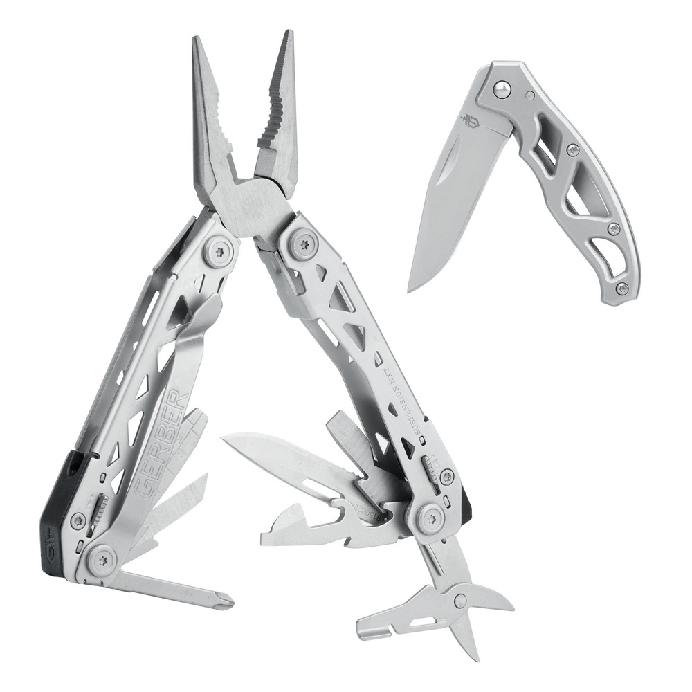 Zestaw dwóch narzędzi marki Gerber, na który składają się multitool Suspension NXT oraz składany nóż Paraframe Mini. Metalowe, ozdobne pudełko czyni z niego doskonały pomysł na prezent.