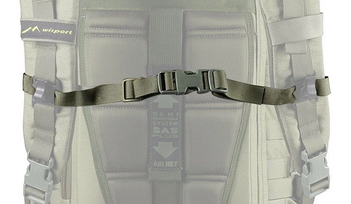 Pasek piersiowy przystosowany do plecaków renomowanego producenta Wisport. Pasek ma szerokość 20 mm i jest zakończony klamrą zatrzaskową. Pasek jest mocowany do szelek plecaka.