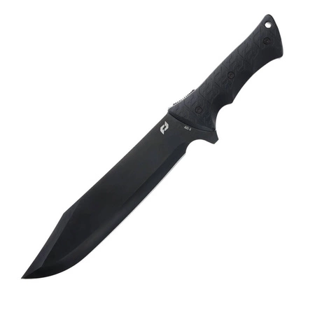 - Ergonomiczna rękojeść z gumy zapewnia pewny i komfortowy chwyt. Duży jelec chroni dłoń użytkownika przed przypadkowym zsunięciem się na ostrze, a karbowane wsparcie pod kciukiem na grzbiecie zapewnia dodatkową kontrolę podczas użytkowania. W tylnej części rękojeści umieszczono otwór na linkę, umożliwiający bezpieczne troczenie noża np. do plecaka wojskowego.