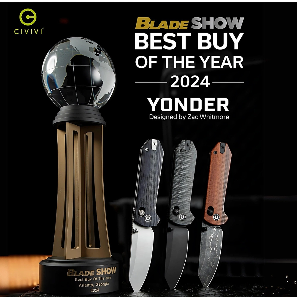 - Yonder Black G10, Stonewashed lekki, uniwersalny folder zaprojektowany przez Zaca Whitmora. Zwycięzca nagrody Best Buy of the Year Award na targach nożowych Blade Show 2024, może rywalizować ze słynnym Elementum o miano najlepszego noża Civivi.
