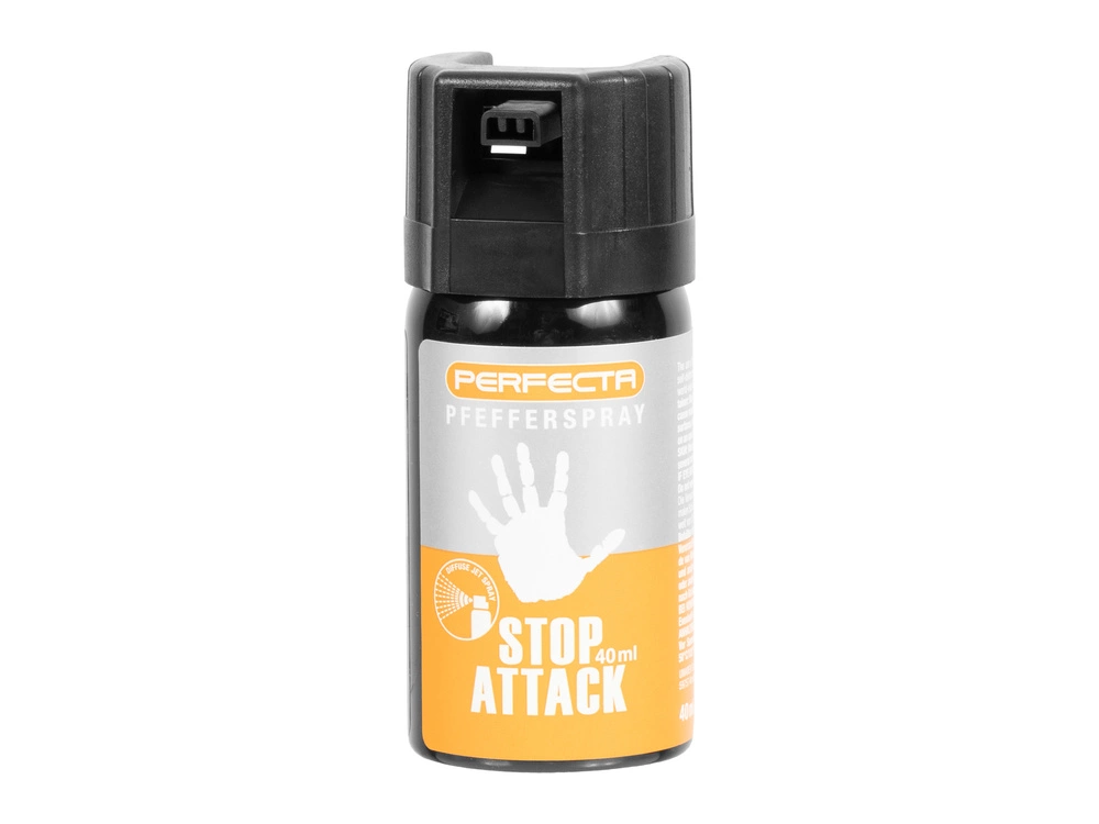 Perfecta Stop Attack stożek 40 ml to skuteczny gaz pieprzowy o zasięgu 4 metrów, który w formie szerokiej chmury uwalnia substancję czynną o 10% stężeniu kapsaicyny.