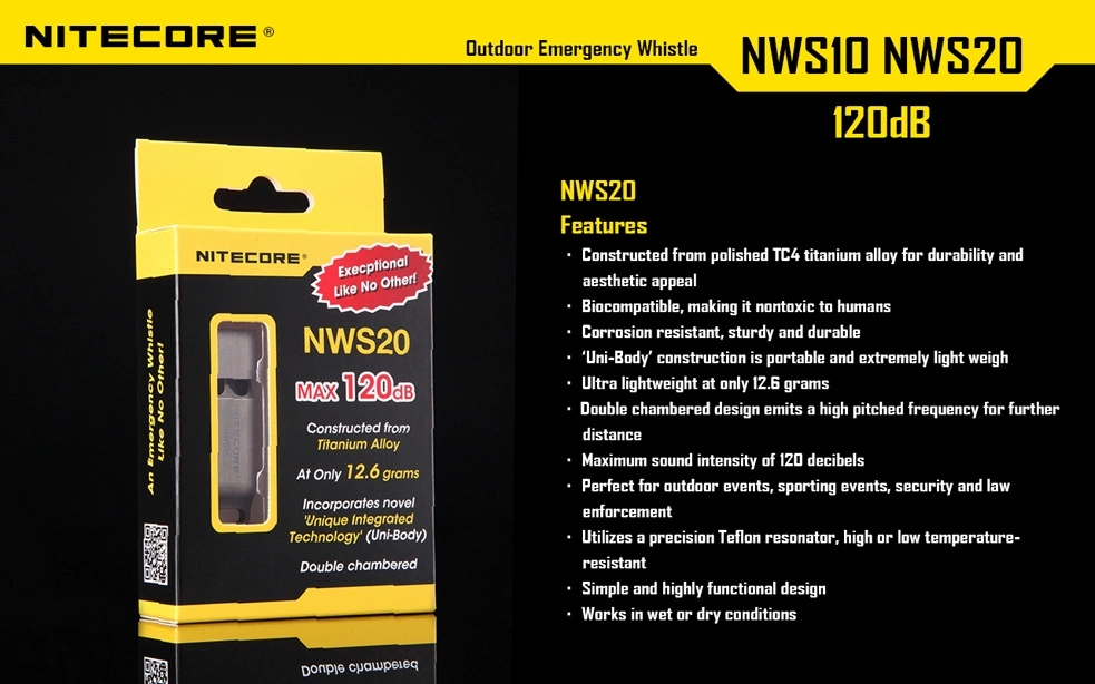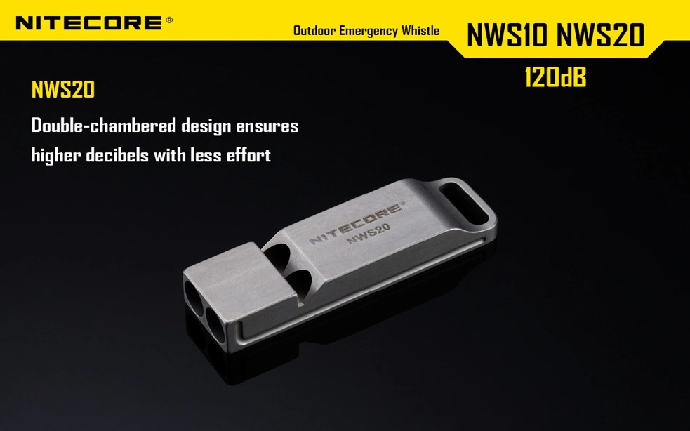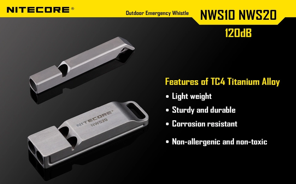 Mały gwizdek o dużej mocy. Bardzo kompaktowy i wytrzymały. Wykonany z tytanu odpornego na rdzę. Doskonale sprawdza się w sytuacjach alarmowych, a także dla trenerów sportowych i instruktorów. Moc gwizdka jest duża, dzięki czemu jest on słyszalny z oddali. 120 decybeli - maksymalna moc gwizdka - jest porównywalna z poziomem hałasu wydzielanym przez wirnik helikoptera z odległości 5 metrów. Dla porównania 140 decybeli to głośność startującego myśliwca.