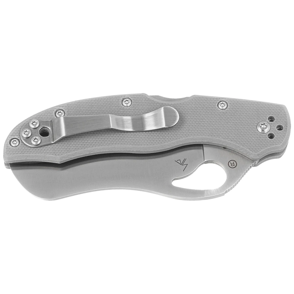 - Gooney Gray G10, Satin niezwykłe połączenie profilu głowni sheepfoot, hawkbill i patentu Spyderco, odwróconej litery "S". W efekcie dostajemy bardzo uniwersalną klingę o znakomitych właściwościach tnących. Okładziny z wytrzymałego kompozytu G10.