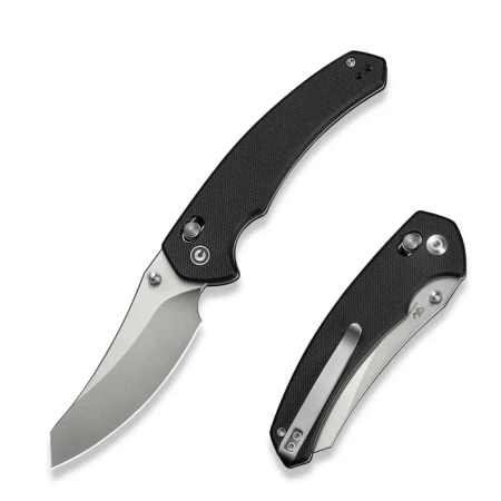 Rękojeść - wykonana z kompozytu G10, praktycznie niezniszczalnego tworzywa, niewrażliwego na warunki atmosferyczne, odpornego na chemikalia i uszkodzenia mechaniczne. Fazowane krawędzie okładek eliminują ostre krawędzie a szorstka faktura i teksturowanie powierzchni zwiększa wygodę i pewność uchwytu. Otwarta konstrukcja tzw. open-backed mocowana stalowymi tulejami dystansowymi redukuję wagę oraz ułatwia czyszczenie. Oś pivota zdobi stylizowane logo marki Civivi. Dwupozycyjny, prawo/lewostronny klips deep carry pozwala przenosić dyskretnie nóż w kieszeni w pozycji tip-up (czubkiem ostrza ku górze).