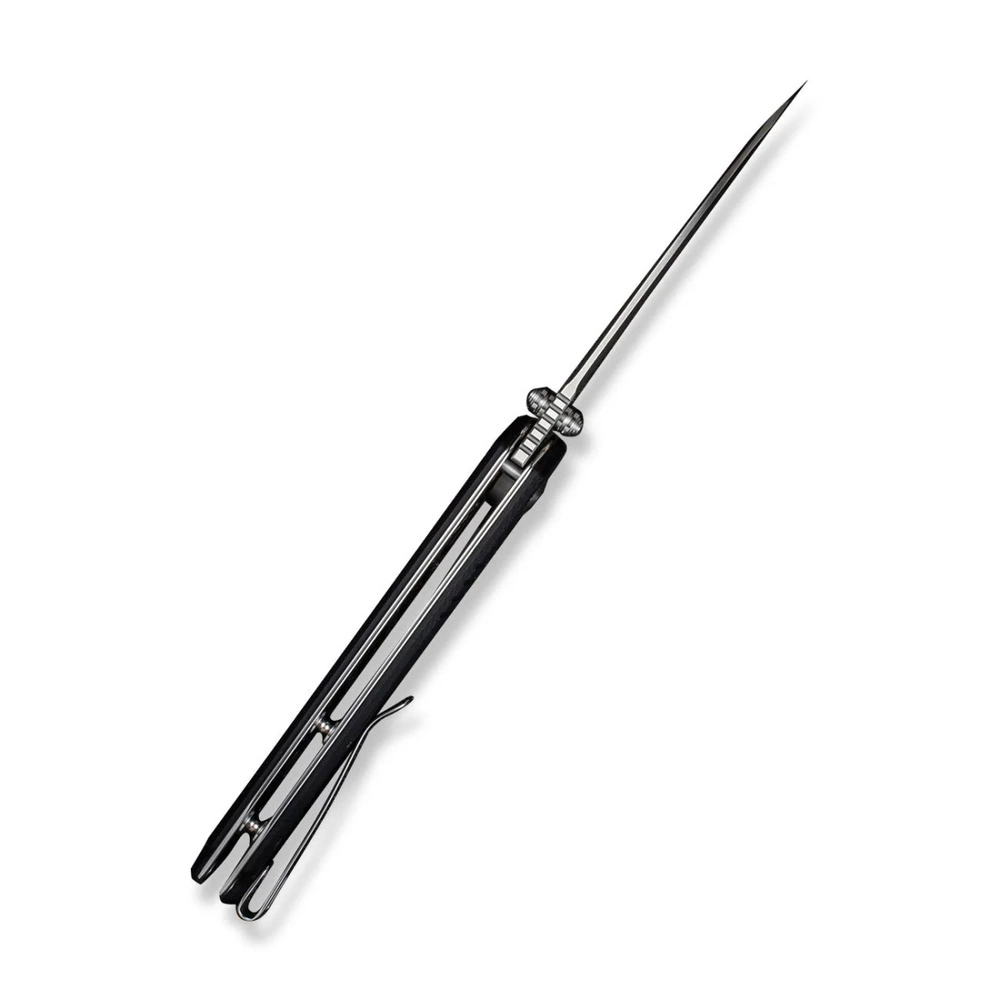 Głownia - typu Wharncliffe o prostej krawędzi tnącej, wykończona eleganckim satynowaniem. Niewielka grubość klingi w połączeniu z wysokim, wklęsłym szlifem daje doskonałą geometrię krawędzi tnącej oraz ekstremalną wydajność cięcia. Ceramiczne łożyska kulkowe wspomagają płynną pracę mechanizmu otwierającego klingę, którą można otworzyć za pomocą szybkiej płetwy flippera (index-finger flipper). Po otwarciu płetwa tworzy mini-gardę zapobiegającą ześlizgnięciu się dłoni na ostrze. Nóż można również otworzyć przy pomocy obustronnego kołka w klindze. Na grzbiecie klingi upper jimping, karbowane oparcie pod kciuk. Całość blokowana jest solidną blokadą liner lock.