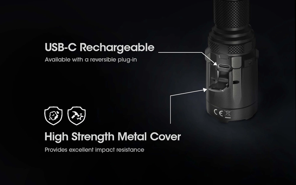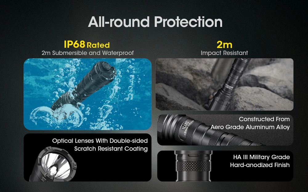 - Latarka jest odporna na wstrząs przy upadku do 2m a także posiada klasę szczelności IP68.