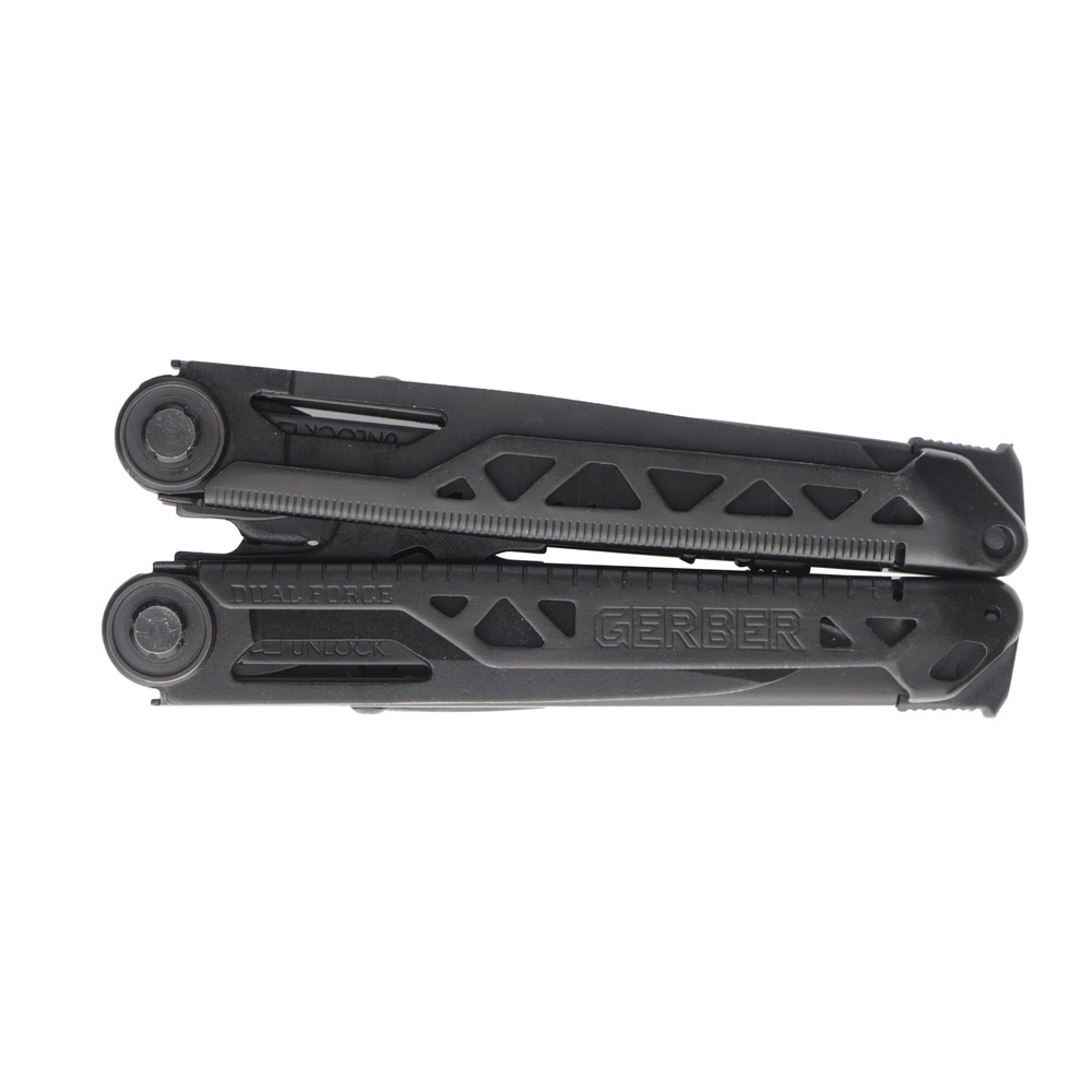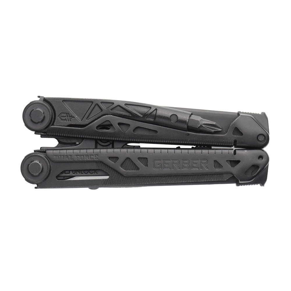 Multitool Dual Force z unikalnymi szczękami i uchwytem na bity Center-axis od firmy Gerber. Został wykonany w pełni ze stali nierdzewnej pokrytej czarną oksydą dla dalszej ochrony przed długotrwałym zużyciem i korozją. Unikalne szczęki Dual Force posiadają trzy różne powierzchnie styku do pracy z drobnymi elementami, a także większymi jak śruby sześciokątne.