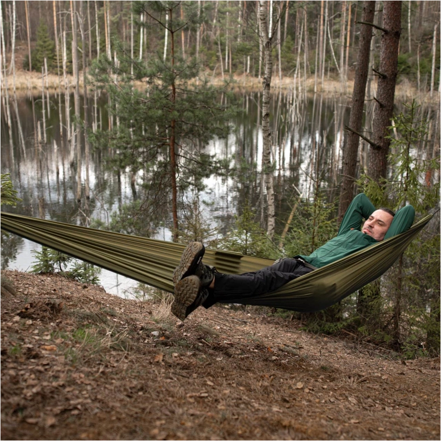 Wykonany z trwałego nylonu typu ripstop, hamak jest odporny na przetarcia i uszkodzenia, a jego ergonomiczny design zapewnia komfort nawet przy wzroście do 190 cm. Maksymalne obciążenie do 200 kg sprawia, że jest bezpieczny i uniwersalny dla każdego.