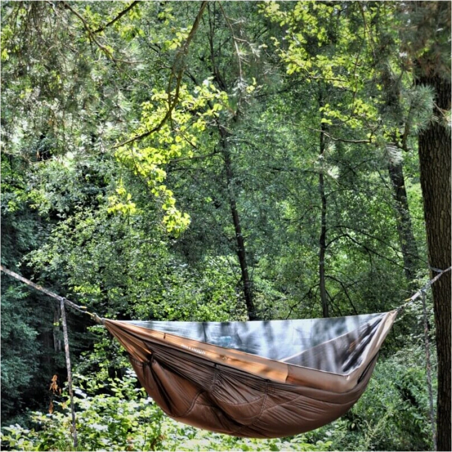 Wyposażony w zintegrowany underblanket (zewnętrzną warstwę), hamak umożliwia dodanie warstwy izolacyjnej, takiej jak karimata czy mata samopompująca, co jest szczególnie przydatne podczas chłodniejszych dni. Stonowana, ciemnooliwkowa kolorystyka dobrze maskuje się wśród roślinności i nie przyciąga promieni słonecznych.