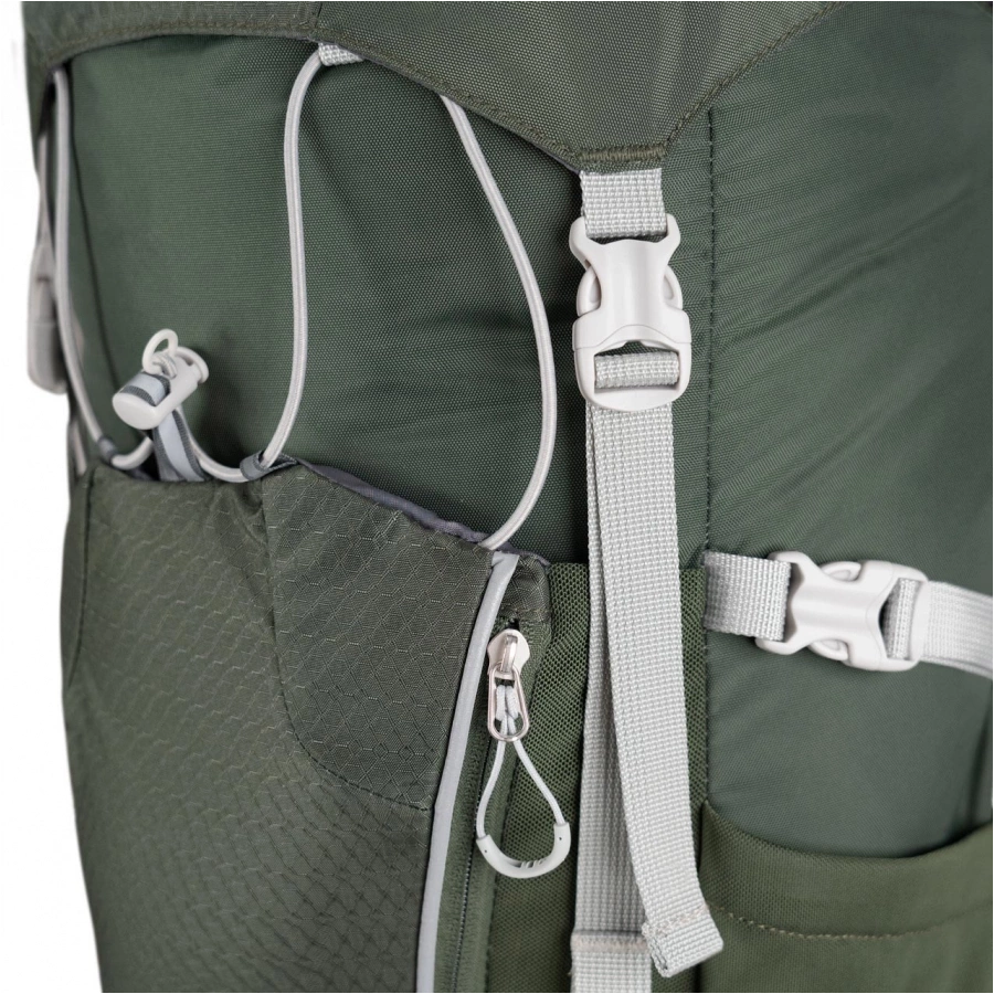 - Praktyczne rozwiązania — dwie komory z dostępem od góry i od dołu, siatkowe kieszenie boczne na mokre ubrania, zapinane kieszonki na pasie biodrowym na cenne drobiazgi, a także system troków i mocowań na sprzęt.