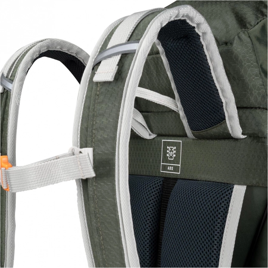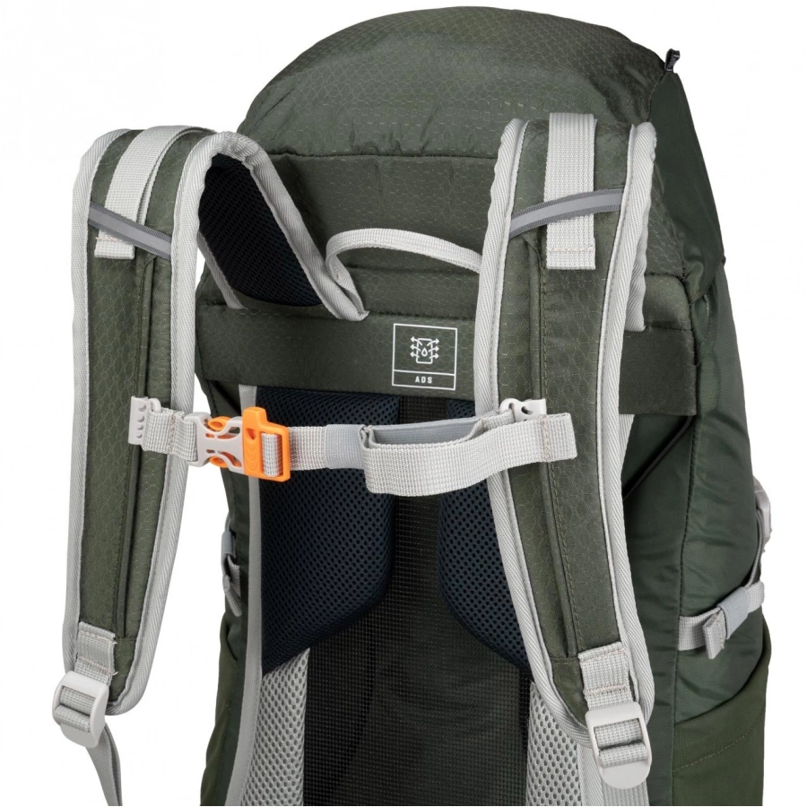 System nośny z aluminiowym stelażem i odizolowaną od powierzchni powierzchnią zapewnia doskonałą wentylację pleców, nawet podczas intensywnego wysiłku. Solidna tkanina nylonowa o strukturze ripstop zwiększa odporność na uszkodzenia i gwarantuje długotrwałe użytkowanie, a klapa z systemem zabezpieczeń minimalizuje ryzyko dostania się wody do środka. W razie nagłych opadów, ukryty w dolnym przedziale pokrowiec o jaskrawym, pomarańczowym kolorze, zadba o Twoją ochronę i widoczność, nawet w najbardziej niesprzyjających warunkach.