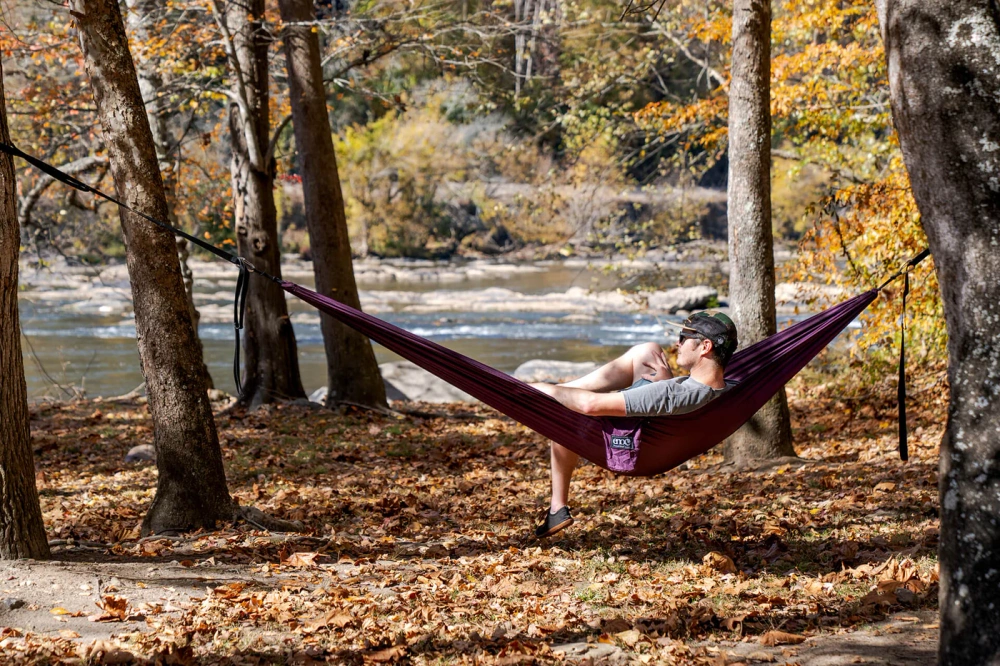 Opatentowane, niewymagające węzłów taśmy do mocowania mają 10 połączonych punktów mocowania i wytrzymałą, przyjazną drzewom taśmę, dzięki czemu możesz się bezpiecznie zrelaksować w ciągu kilku sekund.