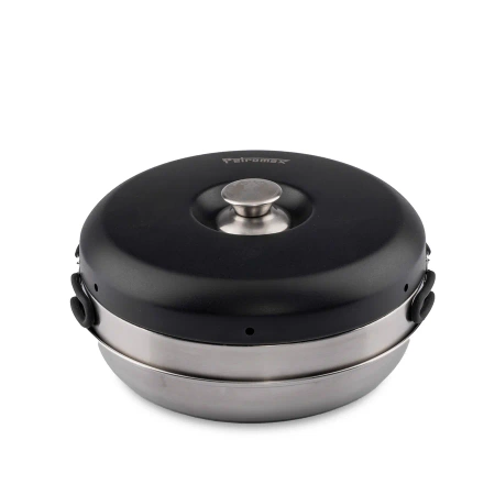 Dzięki kompaktowemu piecowi kempingowemu Petromax Dimego Camp Oven doświadczysz nowej ery gotowania na świeżym powietrzu. Jako idealny dodatek do niezapomnianych chwil kempingowych, piec kempingowy jest idealny do Twoich podróży na świeżym powietrzu. Dzięki wewnętrznej powłoce idealnie nadaje się do świeżych potraw z piekarnika, takich jak zapiekanki, chrupiące bułeczki lub soczyste ciasta. Piekarnik kempingowy składa się z trzech części: elementu podstawowego, który jest umieszczony bezpośrednio na krzyżu do gotowania kuchenki gazowej, powlekanej patelni pierścieniowej z uchwytami i pokrywką.