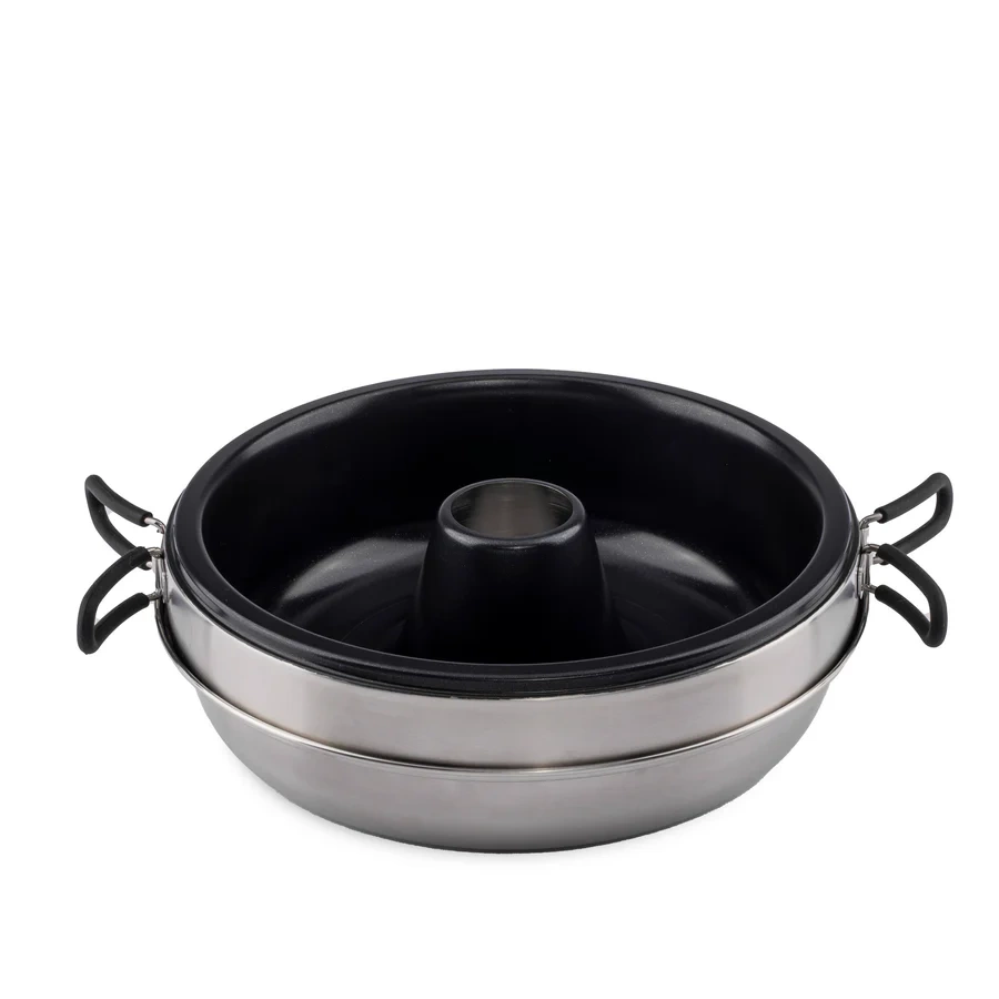 Piekarnik kempingowy oferuje wyjątkową funkcję z potrójną dystrybucją ciepła, która obejmuje ciepło górne, dolne i boczne. Ciepło unosi się od podstawy do naczynia do pieczenia i jest równomiernie rozprowadzane do jedzenia z trzech różnych kierunków: góry, dołu i boków, dzięki pomysłowej dystrybucji ciepła i konstrukcji o podwójnych ściankach. W pokrywie znajdują się otwory wentylacyjne. Ciepło krąży wydajnie w kształcie pierścienia, umożliwiając perfekcyjne ugotowanie różnych potraw z piekarnika. Od warzyw pieczonych z serem po świeżo upieczone bułki i treściwe chili con carne - Twoja wyobraźnia nie ma granic.