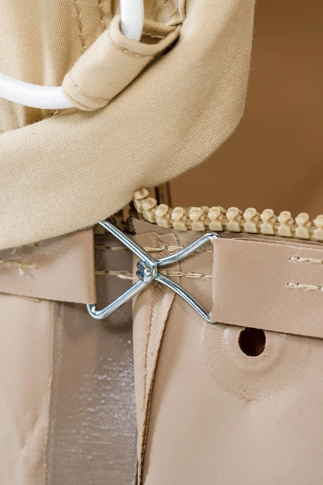Klasyczna konstrukcja gwarantuje stabilność w różnych warunkach, skutecznie chroniąc przed deszczem, wiatrem i słońcem. Namiot może wytrzymać wielomiesięczne stanie w wodzie na głębokości do 5 cm bez przecieków. Drzwi ze zintegrowaną moskitierą zabezpieczają przed owadami i łatwo się je obsługuje dzięki szybkozłączkom. Odblaskowe linki odciągowe odporne na promieniowanie UV, rama statywu ze stali niklowanej oraz kołki z kutej stali potwierdzają profesjonalny charakter konstrukcji. Pałąki odciągowe z systemem linek minimalizują powierzchnię potrzebną do rozłożenia namiotu, dając użytkownikowi większą swobodę w wyborze miejsca kempingu. Dwa wycięcia w dolnych rogach drzwi ułatwiają prowadzenie kabli, a możliwość samodzielnej instalacji otworów wentylacyjnych i wyjść kuchennych daje pełną elastyczność dostosowania namiotu do potrzeb.