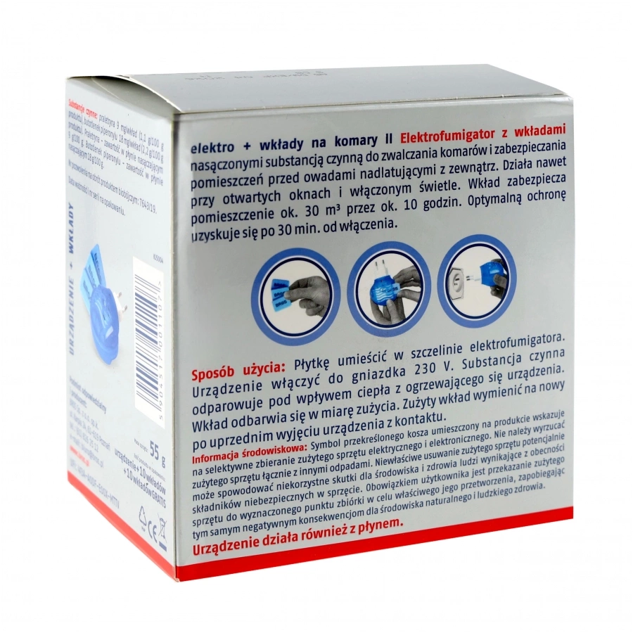 Po podłączeniu do gniazdka urządzenie uwalnia substancję czynną, zapewniając ochronę przez całą noc, nawet przy otwartym oknie i włączonym świetle. Każdy wkład działa nieprzerwanie przez maksymalnie 12 godzin, co czyni zestaw praktycznym i ekonomicznym wyborem na wiele dni użytkowania.