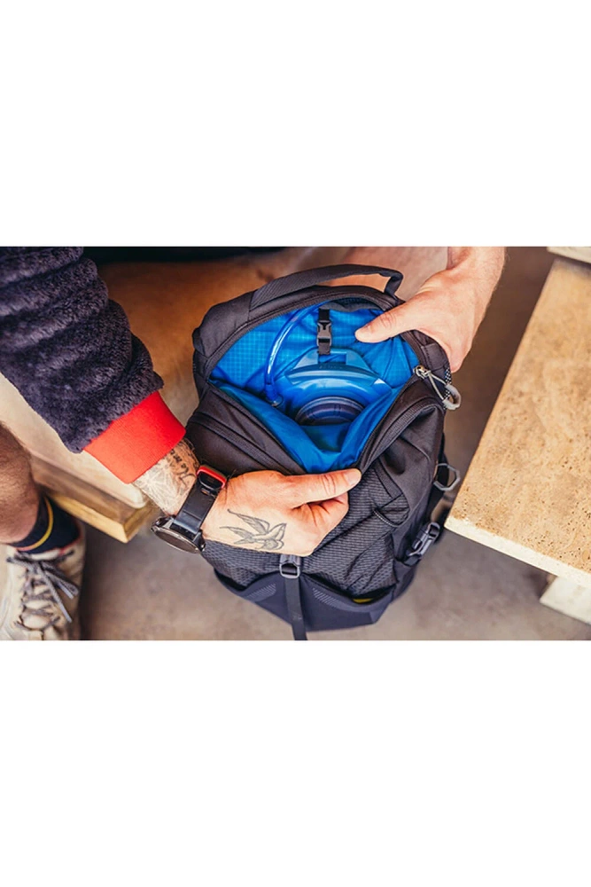 • Zapinana na zamek niezależna kieszeń na bukłak z wodą z możliwością poprowadzenia rurki do mocowania na szelkach, która może także służyć jako miejsce na tablet.