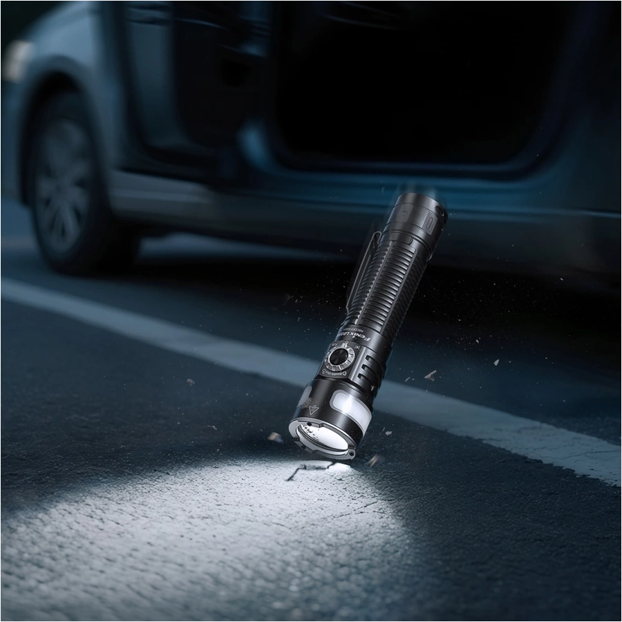 Dzięki nowoczesnej diodzie Luminus SST40 Gen2, LD35R generuje do 1800 lumenów zasięgu do 337 metrów. Dwa paski świetlne COB po bokach głowicy umożliwiają oświetlenie jednostronne lub 360°, idealne do pracy z bliska lub jako światło obszarowe. Dodatkowo światło czerwone pełni funkcję ostrzegawczą, a niebieskie sprawdza się w działaniach taktycznych i specjalistycznych.