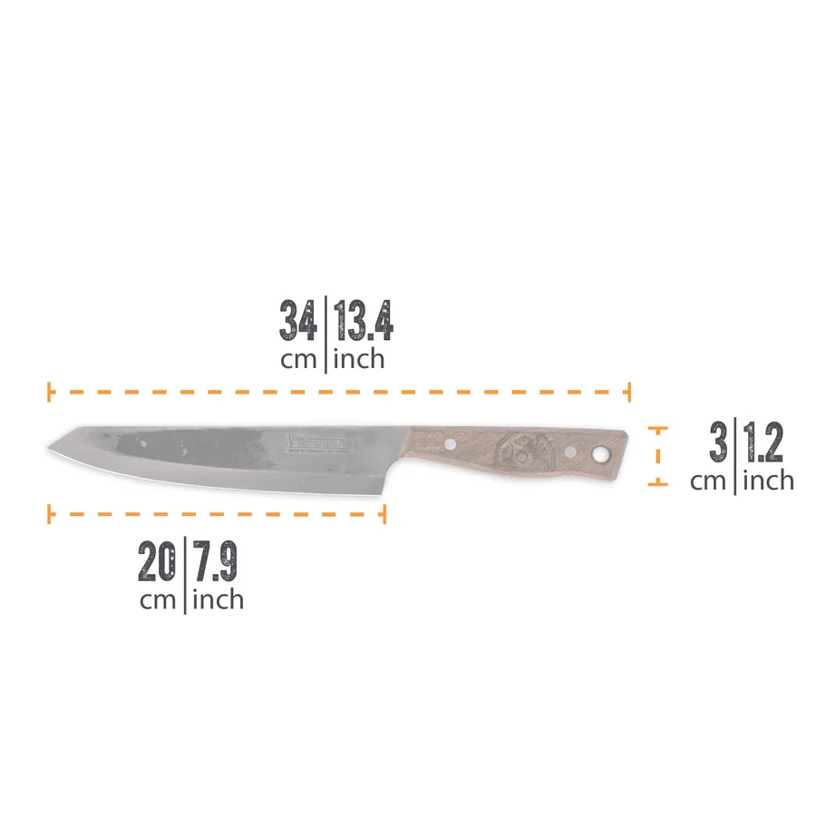 Nóż kucharski Petromax to ręcznie wykonany w Solingen, Niemcy, uniwersalny nóż ze stali nierdzewnej, który doskonale sprawdzi się do krojenia warzyw, filetowania ryb, porcjowania mięsa oraz siekania ziół. Dzięki ostrzu o długości 20 cm i grubości 3 mm z łatwością poradzisz sobie z każdym składnikiem w plenerowej kuchni.