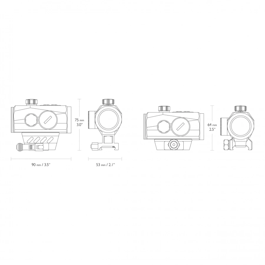 Kolimator wyposażono w znak celowniczy w postaci czerwonej kropki 3 MOA z 8-stopniową regulacją jasności. Dzięki temu możliwe jest szybkie i precyzyjne namierzenie celu w różnych warunkach oświetleniowych. Układ zasilania oparty na baterii CR2032 wspierany jest czujnikiem ruchu, który automatycznie wyłącza urządzenie po 5 minutach bezczynności, znacznie wydłużając czas pracy.