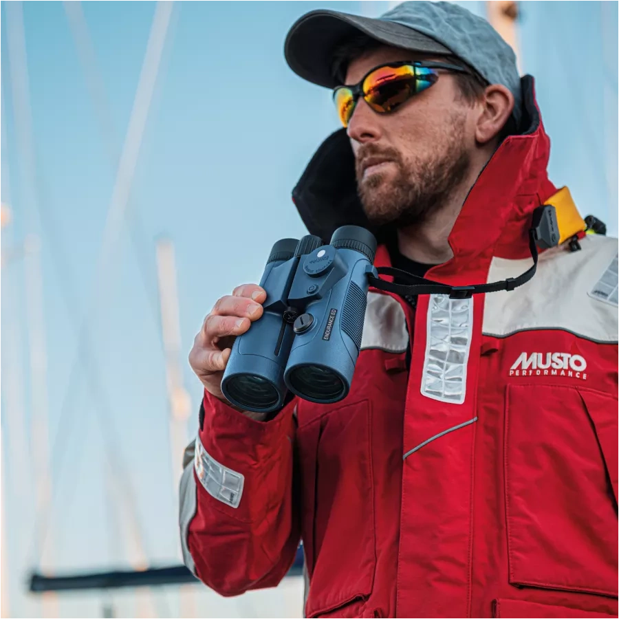Lornetka jest wodoodporna i wypełniona azotem, co zapobiega parowaniu soczewek nawet przy gwałtownych zmianach temperatury – to niezawodne rozwiązanie w wilgotnym środowisku morskim.