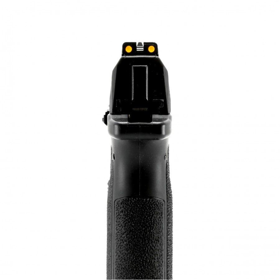 Stałe przyrządy celownicze z kontrastowymi znacznikami – białą kropką na muszce i żółtymi na szczerbince – ułatwiają szybkie i precyzyjne zgrywanie celu nawet przy gorszym oświetleniu.