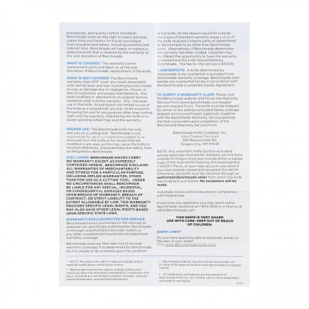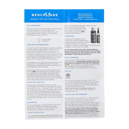 Noże Benchmade to precyzyjne narzędzia tnące – nie używaj ich jako łomu, śrubokręta, dłuta czy przebijaka, chyba że zostały zaprojektowane do tych funkcji.