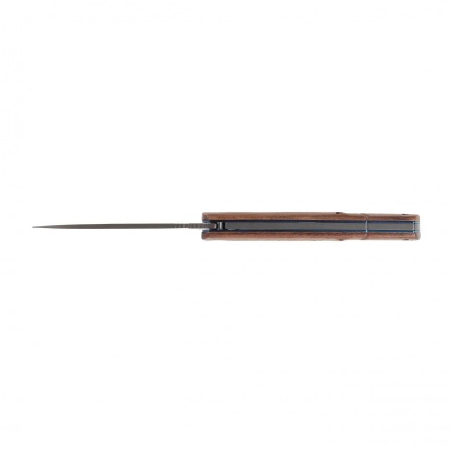 Rękojeść wykonano z matowego drewna orzecha włoskiego, profilowanego z wycięciem na palec dla pewnego chwytu. Blokada Liner-Lock skutecznie zabezpiecza ostrze przed przypadkowym złożeniem po rozłożeniu. Dwuręczne otwieranie przy użyciu wycięcia na paznokieć jest bezpieczne i zgodne z prawem w większości krajów UE.