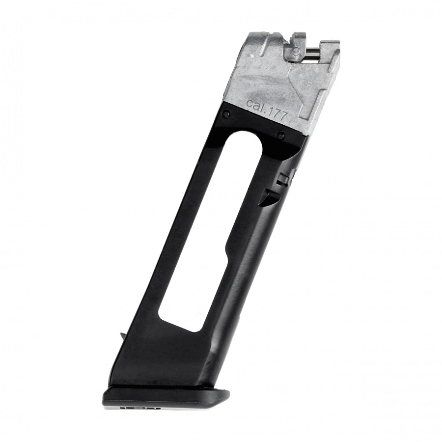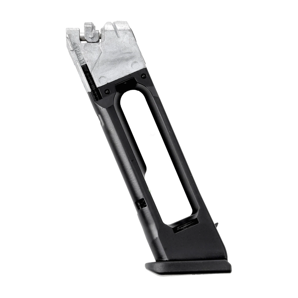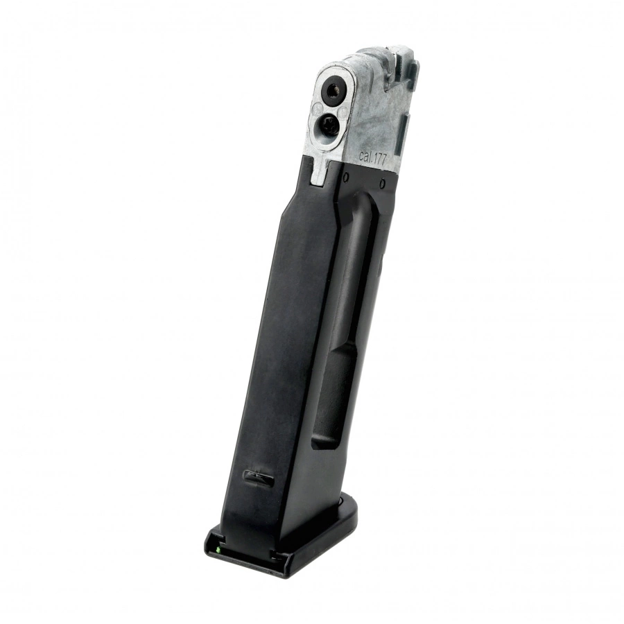 Wewnątrz magazynka znajduje się komora na kapsułę CO₂, a podajnik kulkowy z blokadą ułatwia szybkie i wygodne ładowanie. Magazynek mieści 18 stalowych BB’s, zapewniając komfort podczas treningu i rekreacyjnego strzelania.
