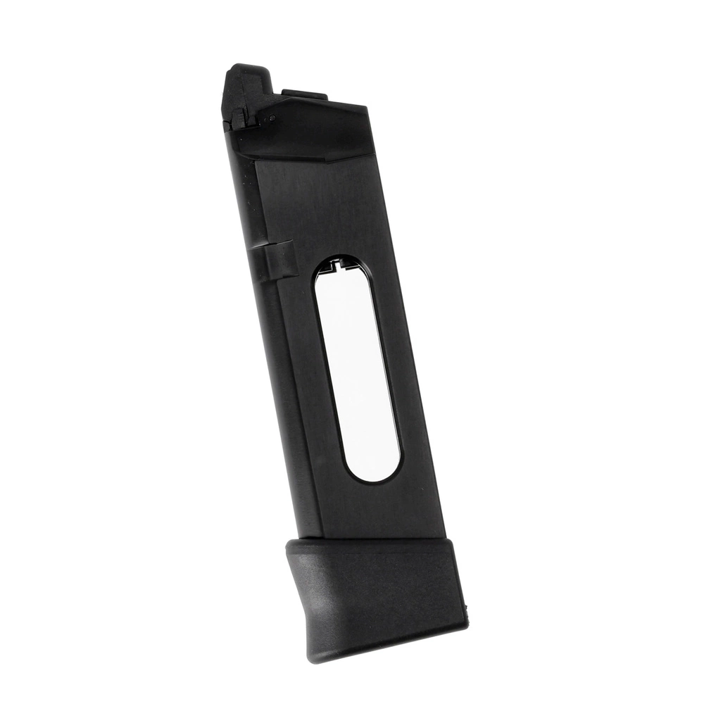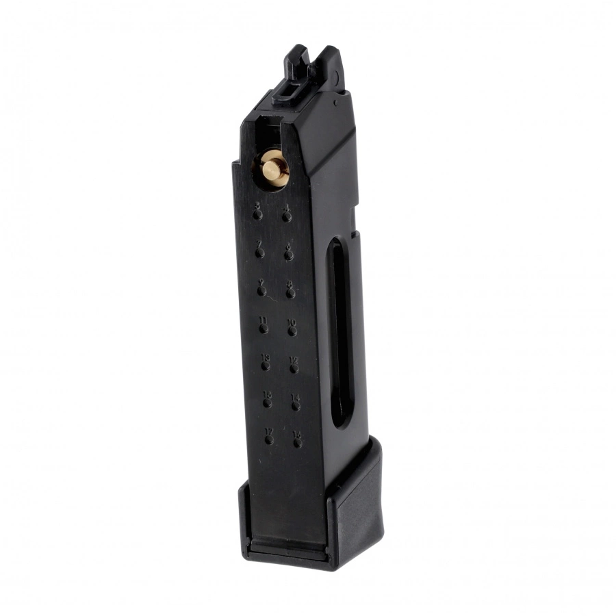 Przedłużony magazynek o pojemności 18 kulek 6 mm, przeznaczony do repliki ASG Glock 19 Gen. MOS 5 zasilanej kapsułami CO₂.