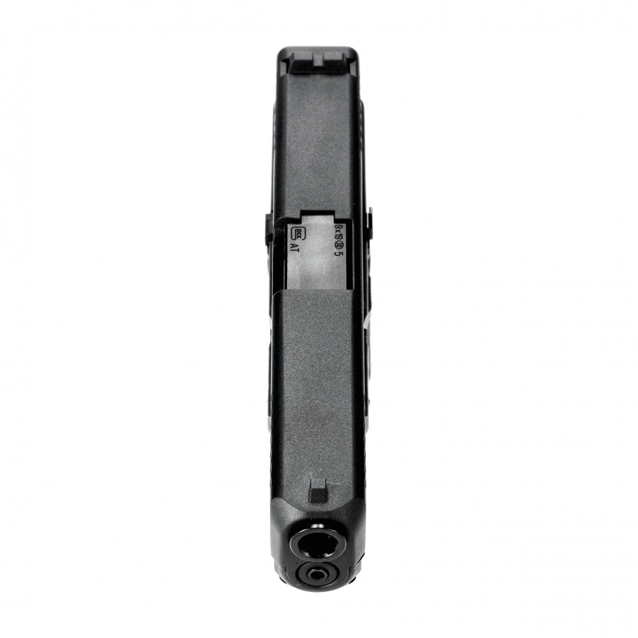 Przednia szyna Picatinny daje możliwość montażu dodatkowych akcesoriów — latarki, wskaźnika laserowego lub innych narzędzi przydatnych w terenie. Na broni umieszczono pełne, licencjonowane oznaczenia Glock oraz numer seryjny, co dodatkowo podkreśla jej kolekcjonerski charakter.