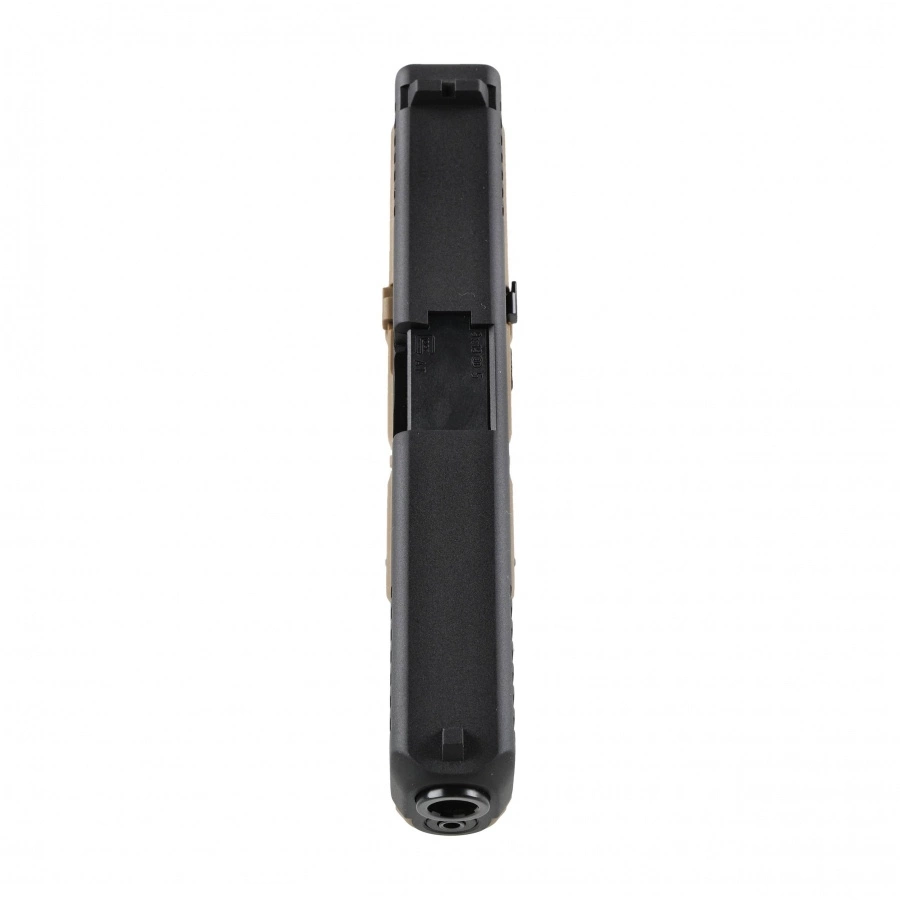 Pistolet posiada stałe przyrządy celownicze: muszkę z białą kropką oraz szczerbinkę z ramką, co ułatwia celowanie również w słabym świetle. W przedniej części szkieletu znajduje się szyna Weaver, pozwalająca na montaż akcesoriów takich jak laserowy wskaźnik celu czy latarka. Na zamku i szkielecie naniesiono licencjonowane oznaczenia Glock oraz indywidualny numer seryjny.