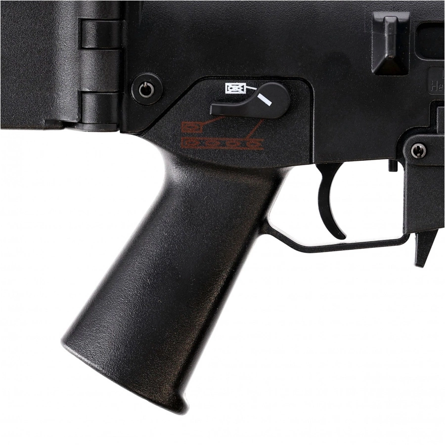 Obustronny bezpiecznik i selektor ognia, umieszczone nad chwytem pistoletowym, zapewniają wygodną obsługę zarówno dla prawo-, jak i leworęcznych użytkowników.