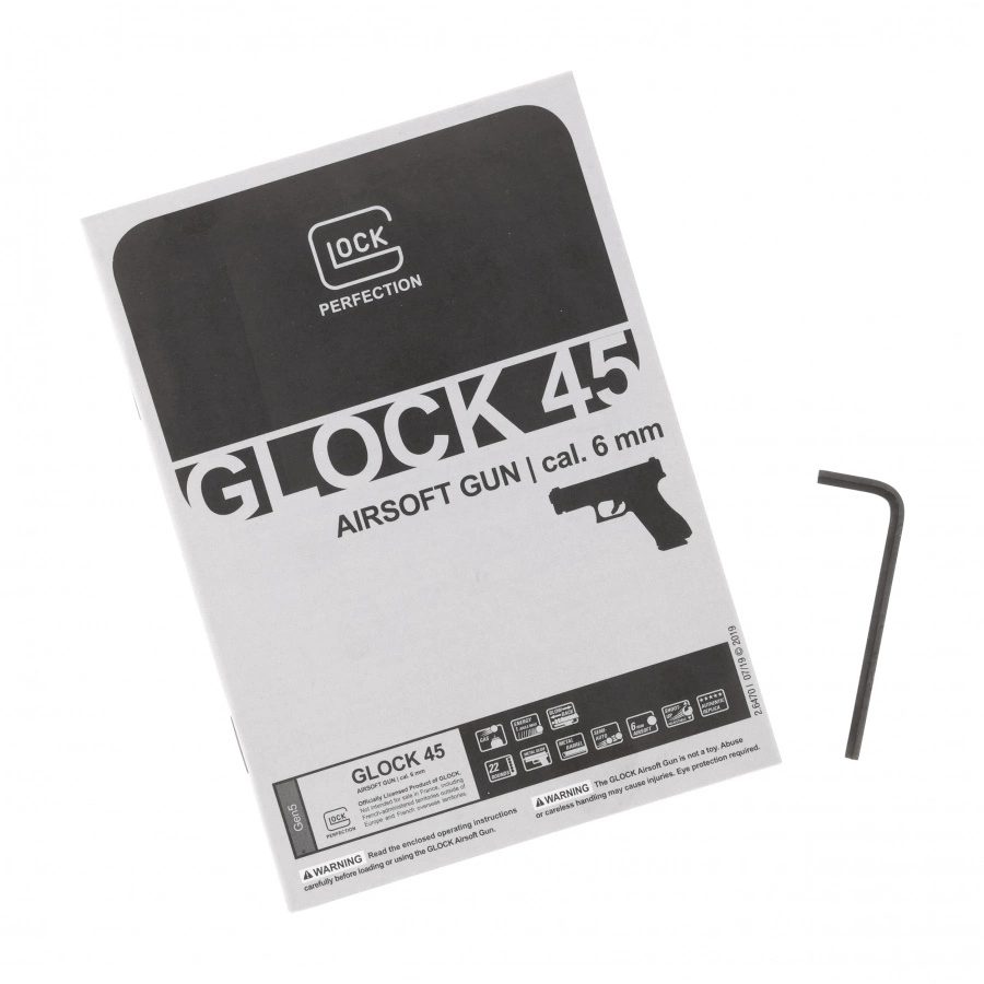 Glock 45 6 mm to wiernie odwzorowana replika austriackiego pistoletu samopowtarzalnego, zbudowana na polimerowym szkielecie i wyposażona w metalowy zamek z dynamicznym systemem Blow-Back. Zasilanie Green Gasem gwarantuje naturalne działanie repliki, a ergonomiczny chwyt oraz pełnowymiarowe wymiary sprawiają, że model świetnie nadaje się jako broń boczna do rozgrywek ASG. Całość utrzymana jest w klasycznej, czarnej kolorystyce.