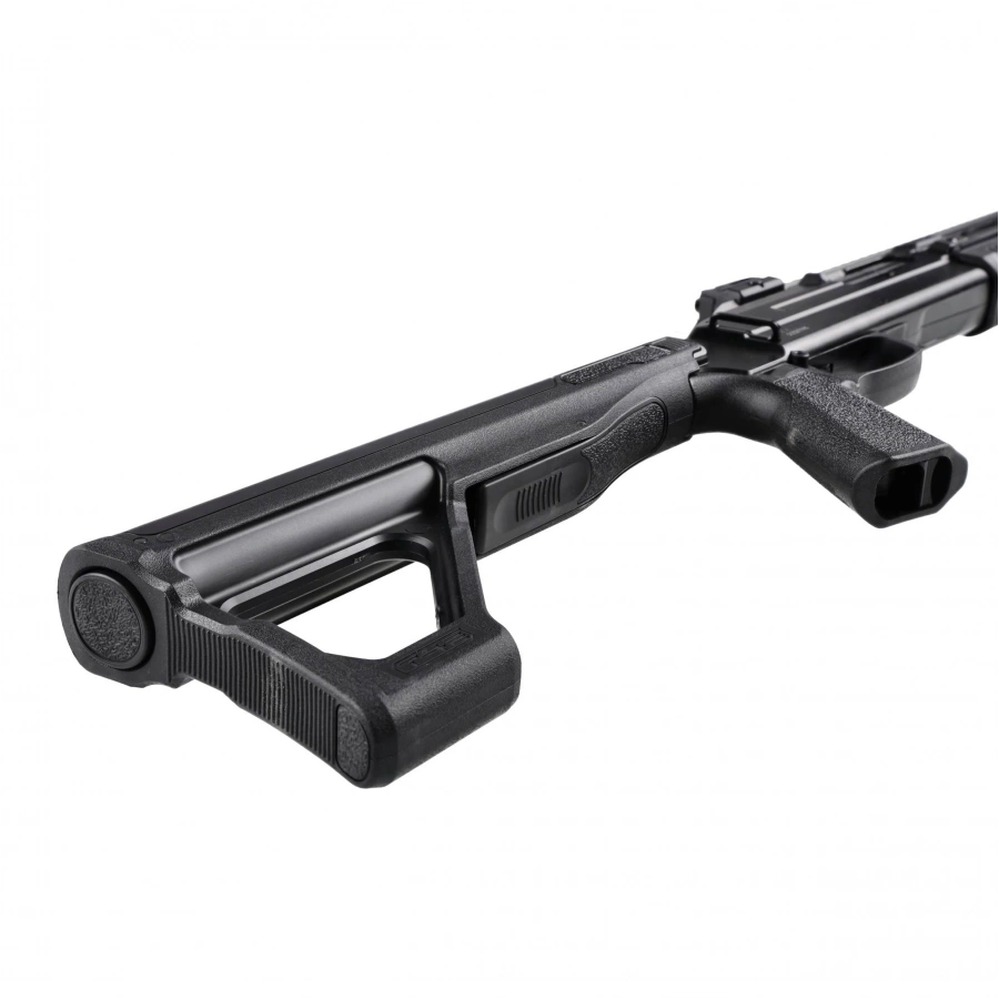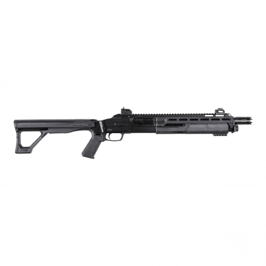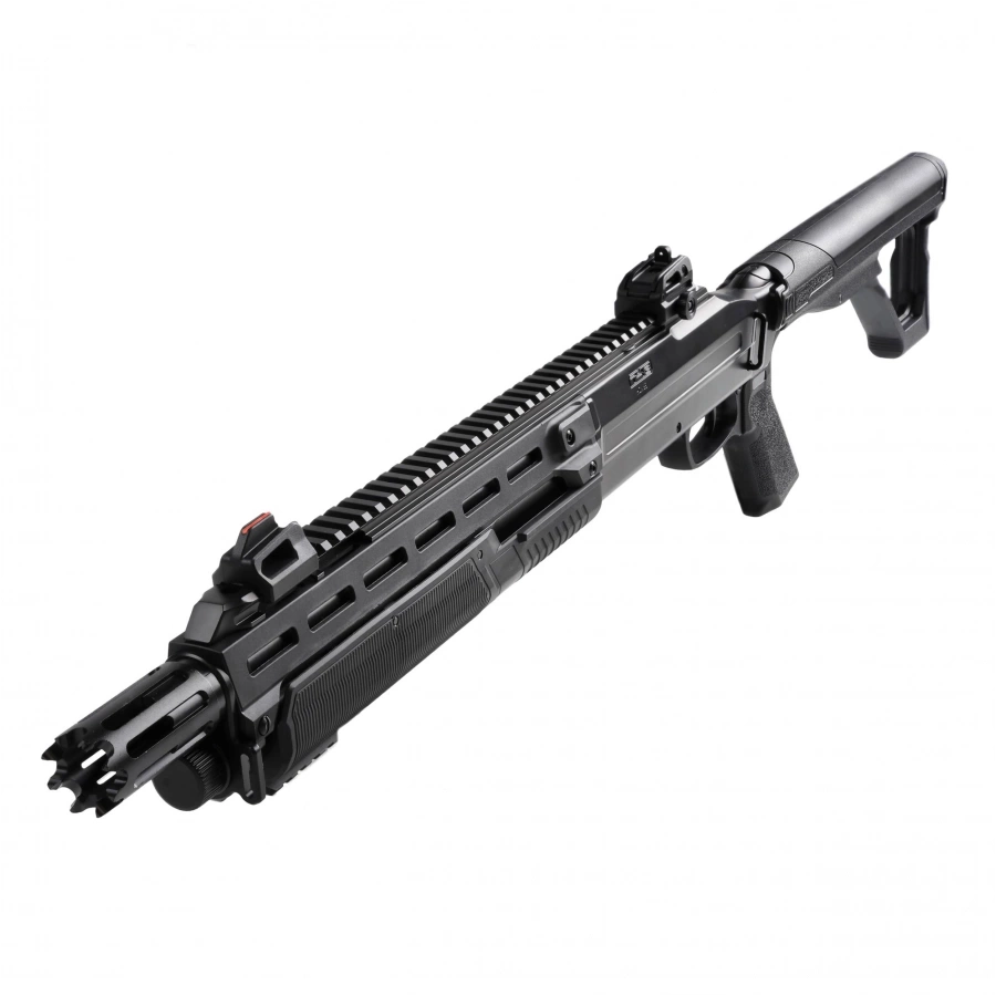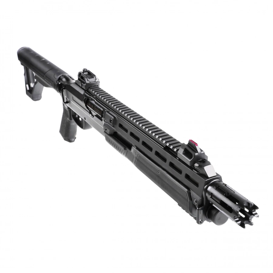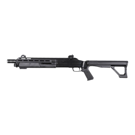 Korpus strzelby wykonano z wytrzymałego polimeru, a kluczowe elementy – takie jak lufa, komora zamka, magazynek rurowy czy mechanizm spustowy – z metalu, co zapewnia trwałość i realizm obsługi. Na grzbiecie umieszczono szynę Picatinny z mechanicznymi przyrządami celowniczymi: światłowodową muszką i regulowaną szczerbiną. Dzięki systemowi M-Lok użytkownik może łatwo zamontować dodatkowe akcesoria, np. latarkę lub wskaźnik laserowy.