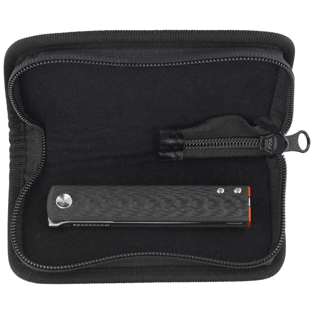Rękojeść - z kompozytu 3K Carbon Fiber, materiału zapewniającego wysoką wytrzymałość i wyjątkową lekkość. Jej powierzchnia została delikatnie teksturowana w celu poprawy chwytu, a ergonomiczne profilowanie zwiększa komfort trzymania nawet podczas dłuższej pracy. Anodowany backspacer w kolorze pomarańczowym usztywnia konstrukcję i wprowadza dynamiczny akcent stylistyczny. Użytkownik ma do dyspozycji dwustronny klips typu deep carry umożliwiający dyskretne noszenie oraz blokadę liner lock, która gwarantuje bezpieczeństwo podczas użytkowania. W zestawie elegancki pouch z wysokojakościowej skóry do przechowywania i przenoszenia noża.