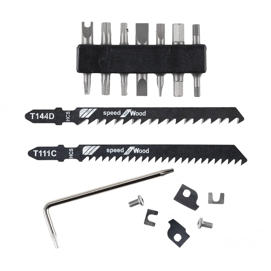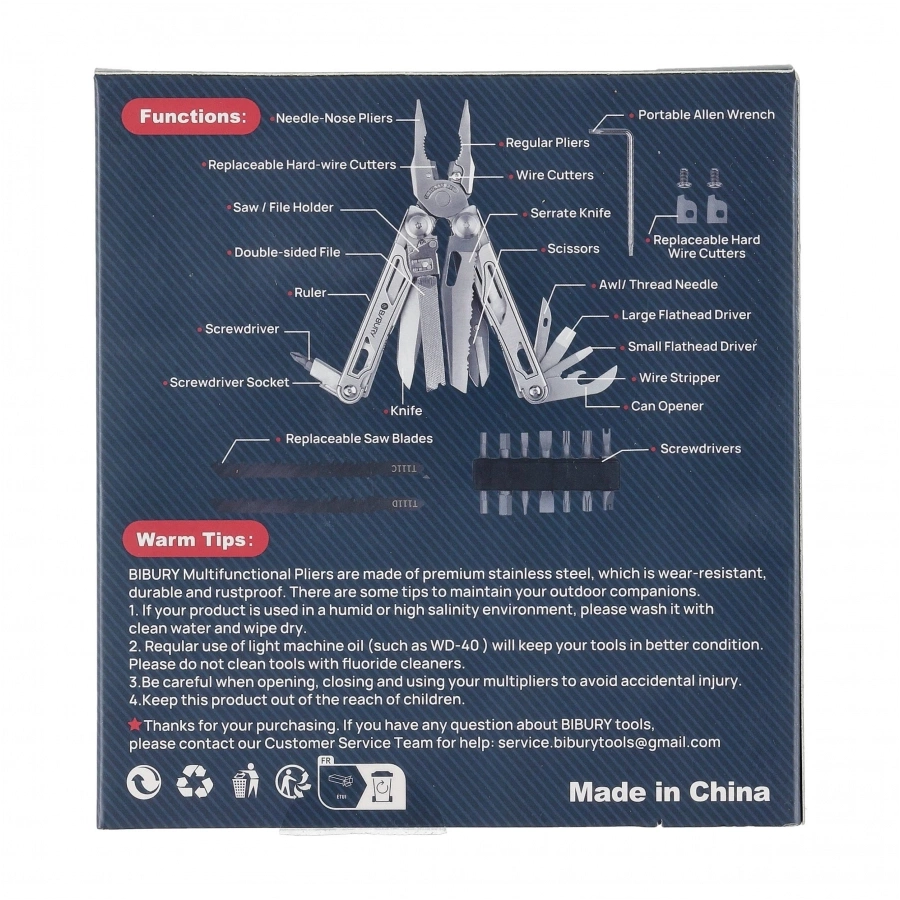 Wyposażony w 19 funkcji, obejmujących m.in. kombinerki, szczypce precyzyjne, przecinaki do drutu, piłę, ostrza, nożyczki, pilnik, wkrętaki oraz otwieracze, multitool Bibury Pro umożliwia szybkie wykonanie drobnych napraw czy prac serwisowych. W zestawie znajdują się także 3 wymienne bity, które można zamontować na rozkładanym trzpieniu.