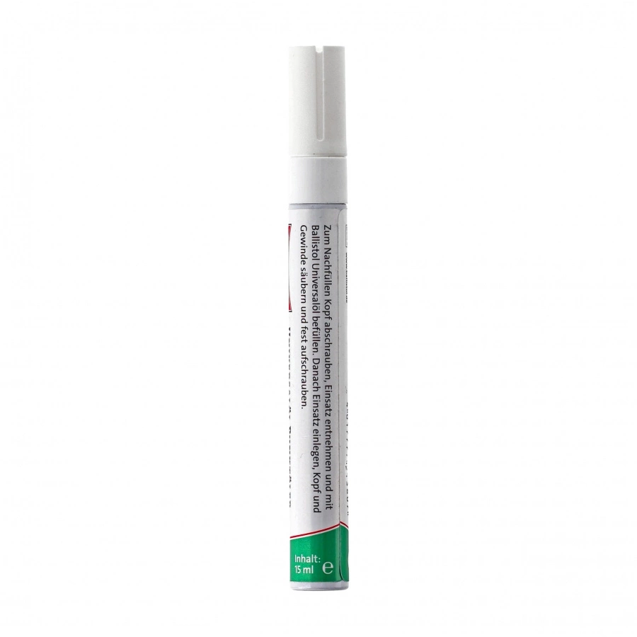 Olej w zakraplaczu Ballistol 15 ml ma punktowy dozownik, służący do precyzyjnego smarowania małych części broni i maszyn. Pojemnik jest otwierany, dzięki czemu możemy samodzielnie uzupełniać sztyft olejem Ballistol.