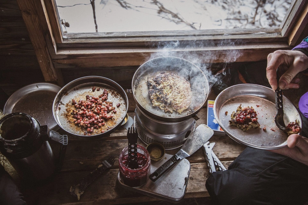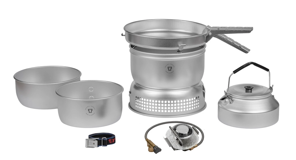 TRANGIA STOVE 25 (LARGE) to większa kuchenka, idealna dla 3-4 osób. Wszystkie kuchenki z serii 25 zawierają dwa rondle o pojemności 1,75 i 1,5 litra, patelnię, osłonę przeciwwiatrową (podstawa górna i dolna), palnik, uchwyt i pasek. W zależności od modelu, dołączony jest czajnik turystyczny 0,9 litra, palnik spirytusowy lub gazowy. Kolekcja zawiera kilka kompletnych kombinacji z różnymi materiałami użytymi do produkcji i wykończenia garnków, patelni i osłon przeciwwiatrowych. Wymiary wszystkich kuchenek 25 Large są takie same: po spakowaniu mają 22 cm średnicy i 10,5 cm wysokości.