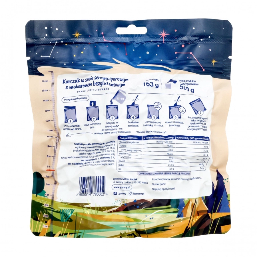 Lyommy - Żywność liofilizowana Kurczak w sosie serowo-porowym z makaronem bezglutenowym 500 g