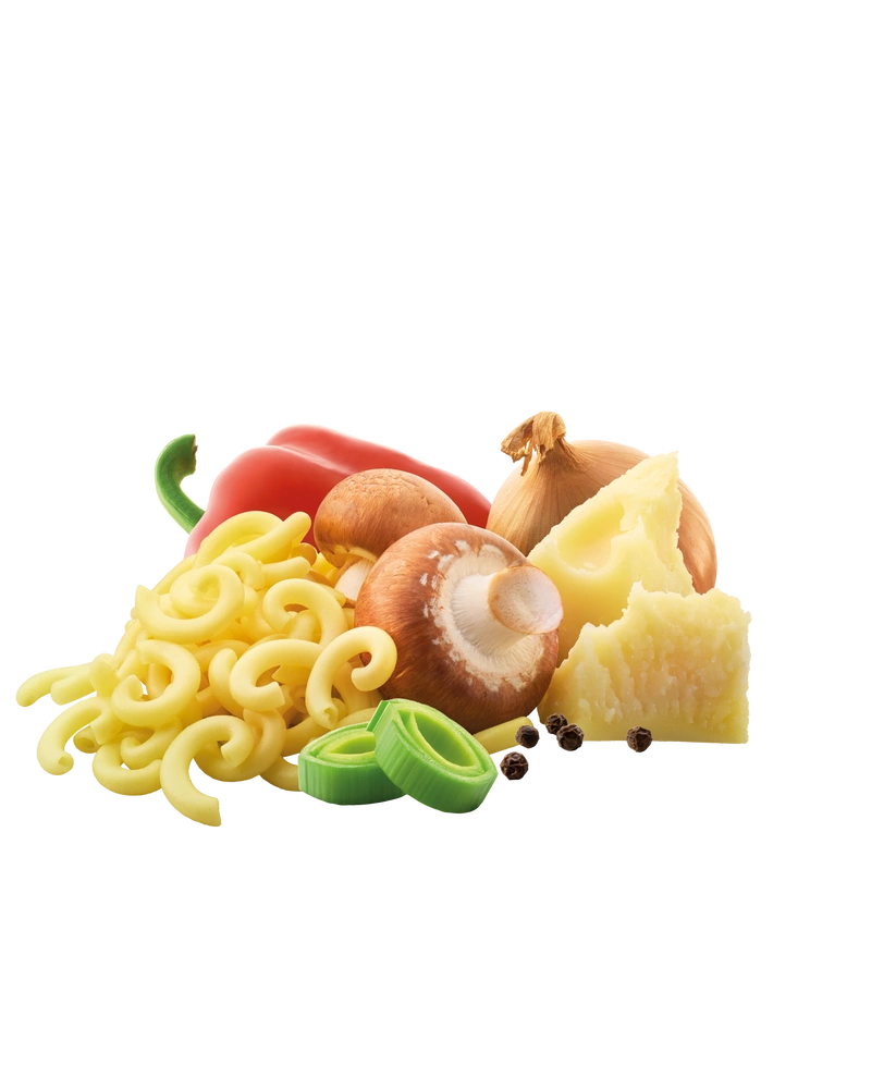 Połączenie delikatnego makaronu z serem Ementaler, warzywami i pieczarkami tworzy doskonały balans smaku i wartości odżywczych. Lekka forma i szybkie przygotowanie sprawiają, że to idealny wybór na wyprawy górskie, biwaki, rejsy, trekking czy długie podróże samochodowe.