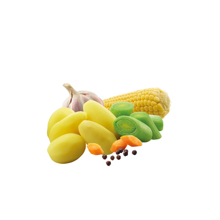 Jarskie danie z ziemniakami i bukietem warzyw. Z soją, porami, kukurydzą, marchwią i czosnkiem w sosie bulionowym.